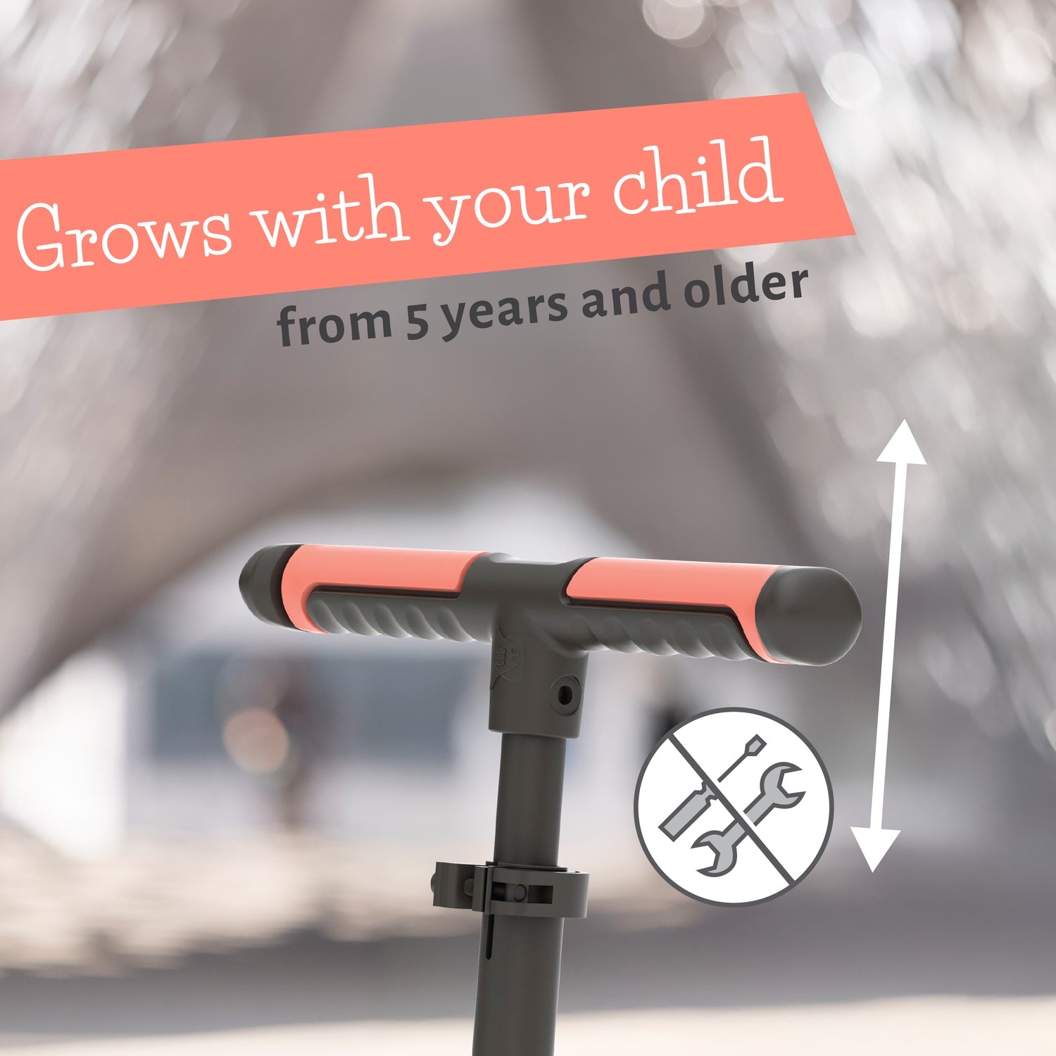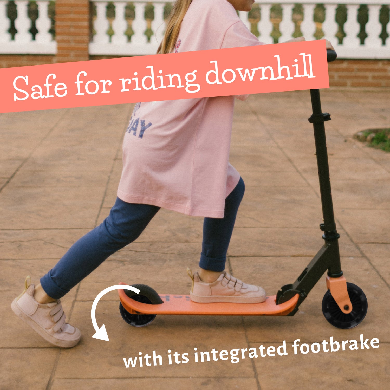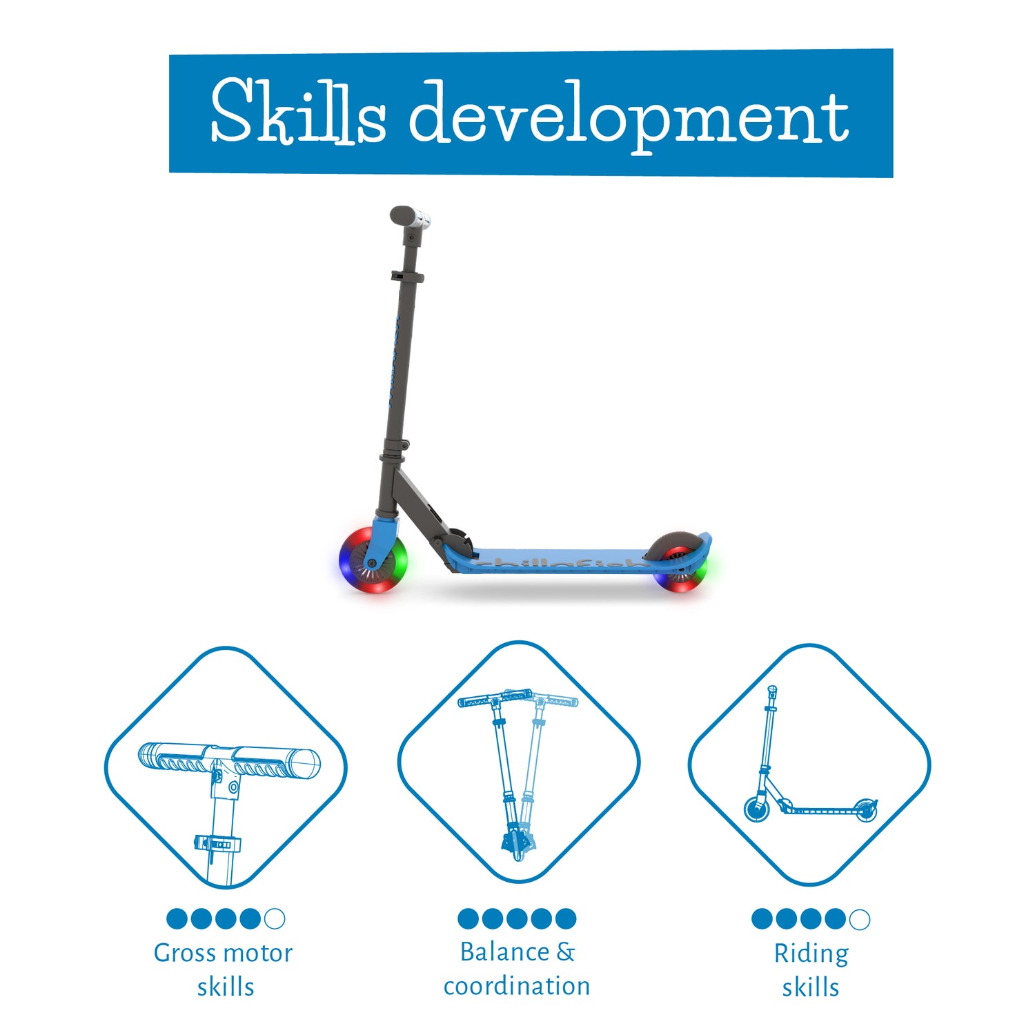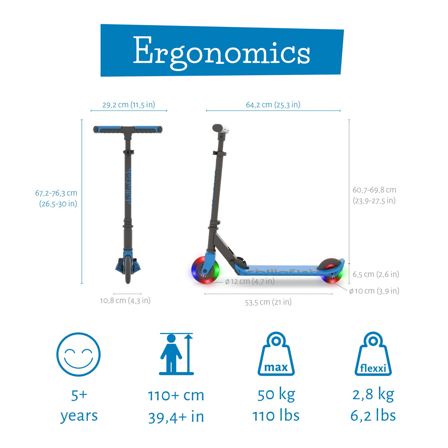 Flexxi Glow is our first foldable 2-wheeled scooter for kids age 5 and up, now with LED lights in the wheel! It's lightweight, easy to transport and rolls wherever you want to go! The scooter has a signature twintip deck with integrated footbrake. The handlebar folds in a snap without tools so you can easily take Flexxi Mini along to friends or to the park. Just unlock and fold, it's as easy as that! Adjust the handlebar height to suit small kids and tall friends - the handlebar can be adjusted from 67 cm to 77 cm (26,4-30,3 inch). The high quality ABEC-5 wheels make you roll like you'll never stop and the handlebar is equipped with comfy handgrips that feel like you'll never want to let go. The LED lights do not need any batteries, they are simply powered by riding the scooter. The deck is lightweight yet strong, for kids up to 50 kg. Play Longer!