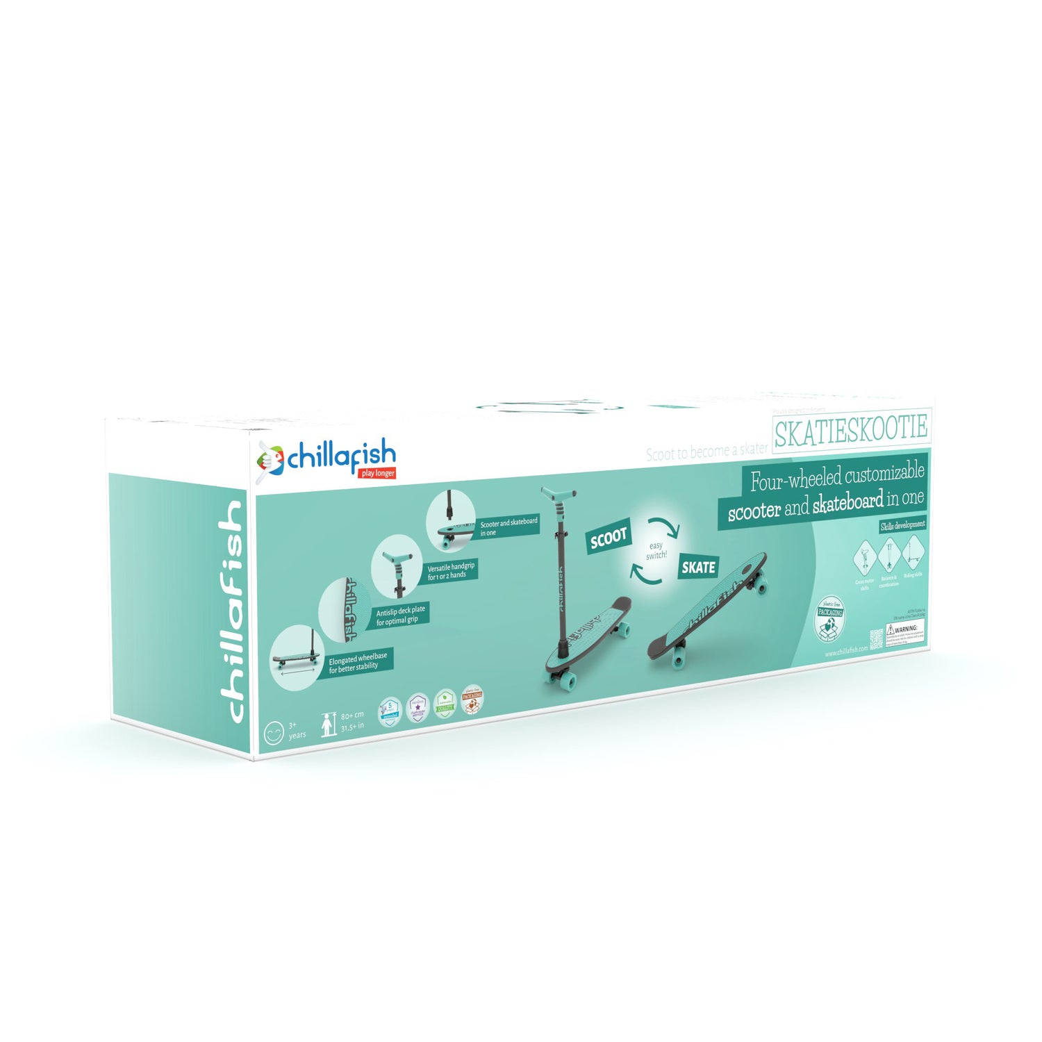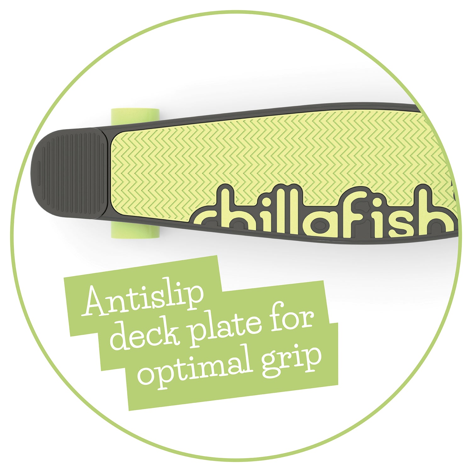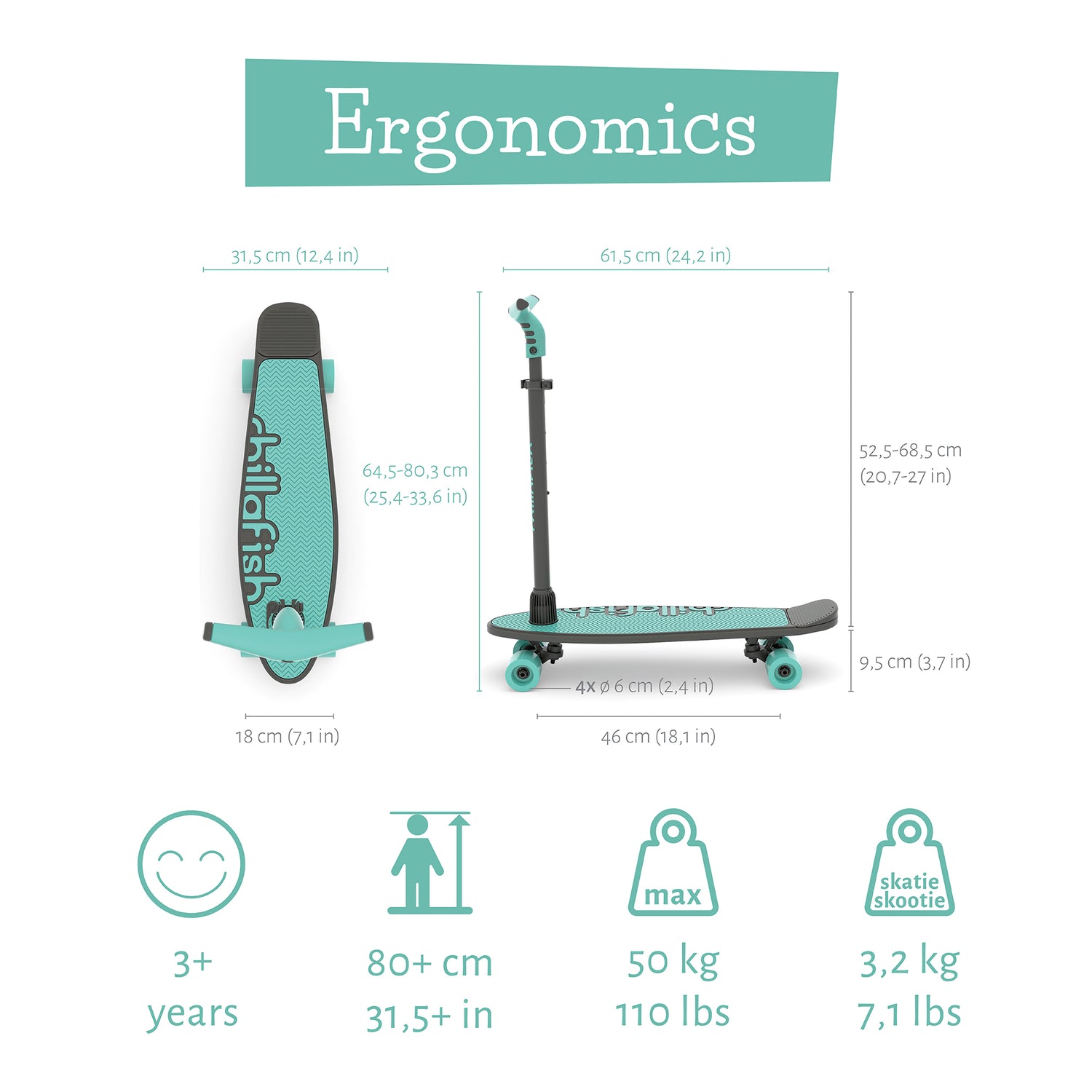 チラフィッシュ スケーティースクーティーはカスタマイズ可能な2-in-1タイプのスケートボードとスクーターがひとつになったスクーター。四輪のホイールベース間隔が長めのつくりと取り外し可能なハンドルバーで、お子様も安心してバランス感覚を養うことができます。 スケーティングをしたことのないお子様は、はじめハンドルバー付きで、慣れてきたら取り外してスケートボードとして楽しむことができます。ハンドルバーは、回してロック解除して、引くだけで簡単に取り外し可能。