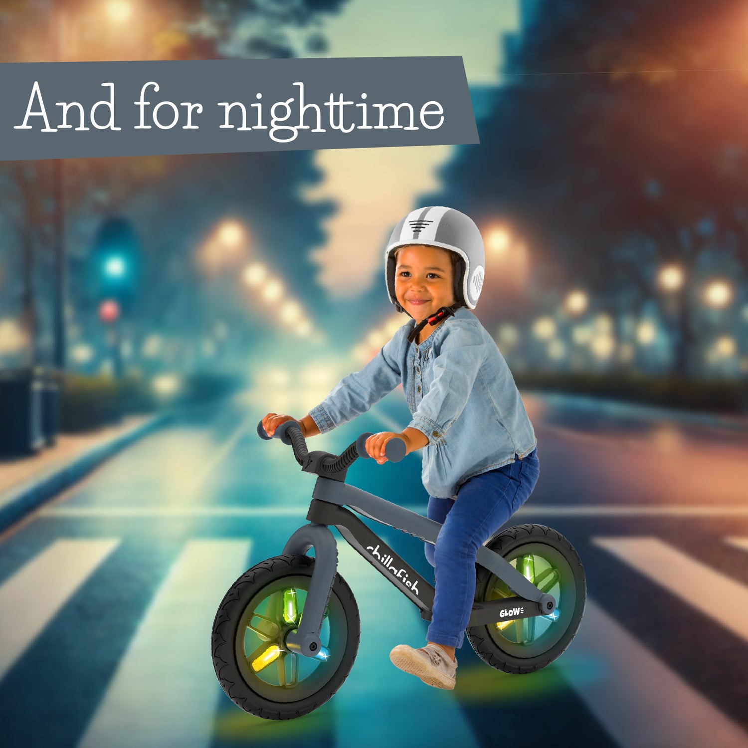 Chillafish BMXie GLOW is the first balance bike with 12 inch integrated light-up wheels that shine bright when riding for extra fun and visibility.