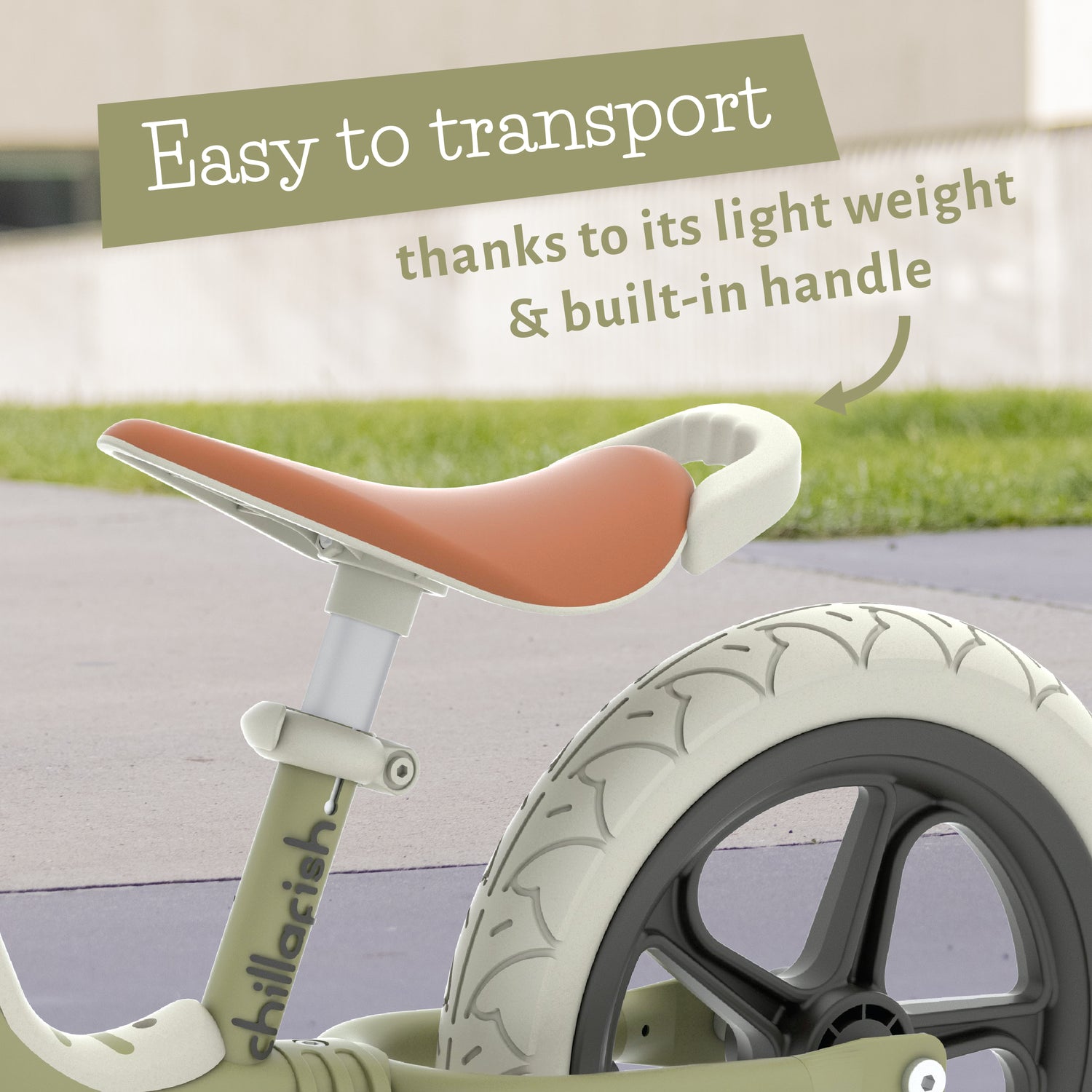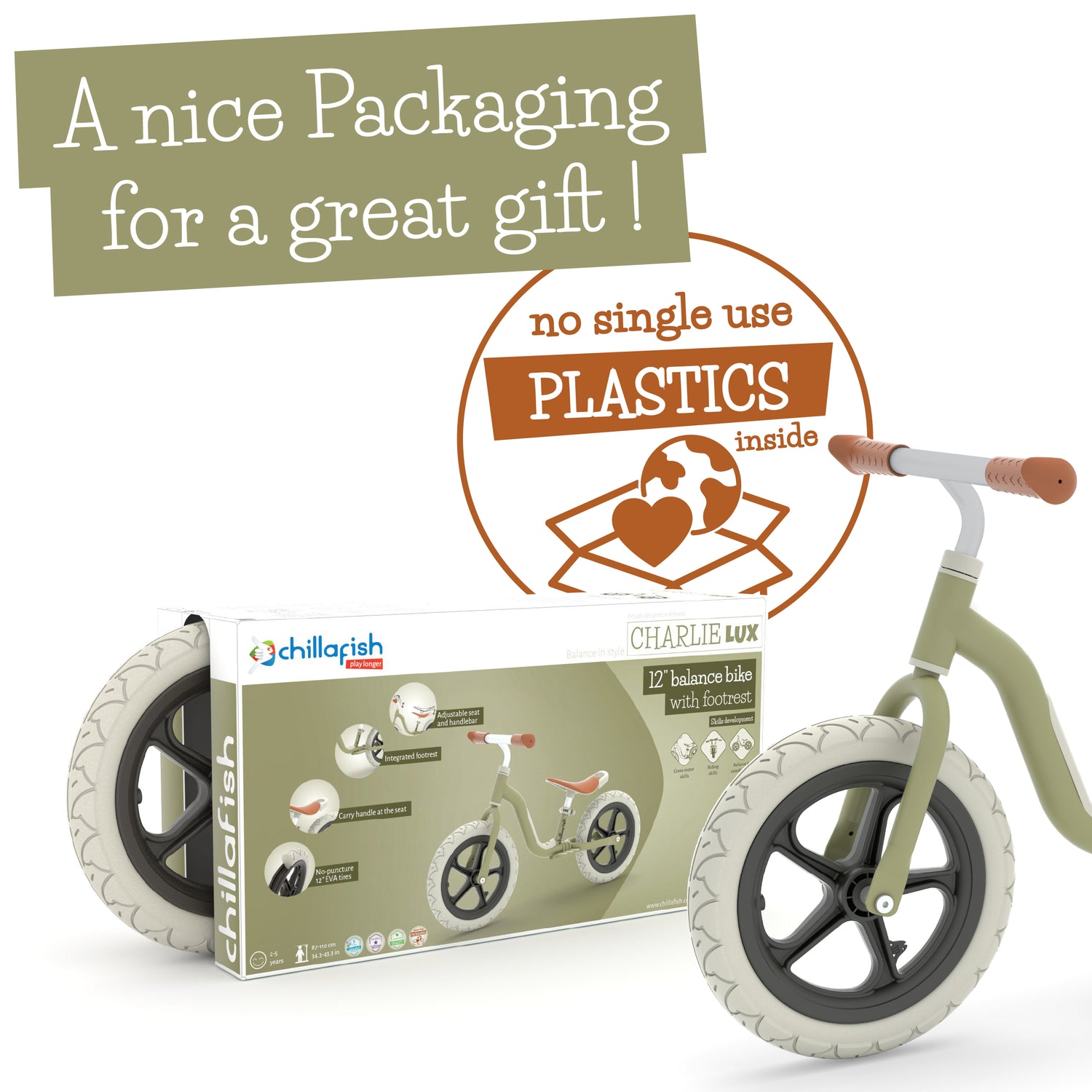 Chillafish Charlie Lux is a hyper lightweight 12" balance trainer with puncture-proof tires and a high-quality metal frame weighing only 6,6 lbs / 3 kg. The perfect toy to train your toddler gross motor skills, balance and steering. The custom molded comfort seat and handlebar are easily adjustable in height. The seat is adjustable from 12.6-15.7 inch / 32-40 cm and the handlebar can adjust from 19.5-20,9 inch / 49,5-53 cm. Thanks to its lightweight frame your toddler can easily control the bike and, in combination with the integrated carry handle at the seat, it makes it easy for parents to carry it as well. The no-puncture 12-inch EVA tires are really comfortable: no need to inflate the tires anymore, no puncture risk, from now on only fun! Charlie Lux balance bike will teach your kids to ride a real bicycle in no time!