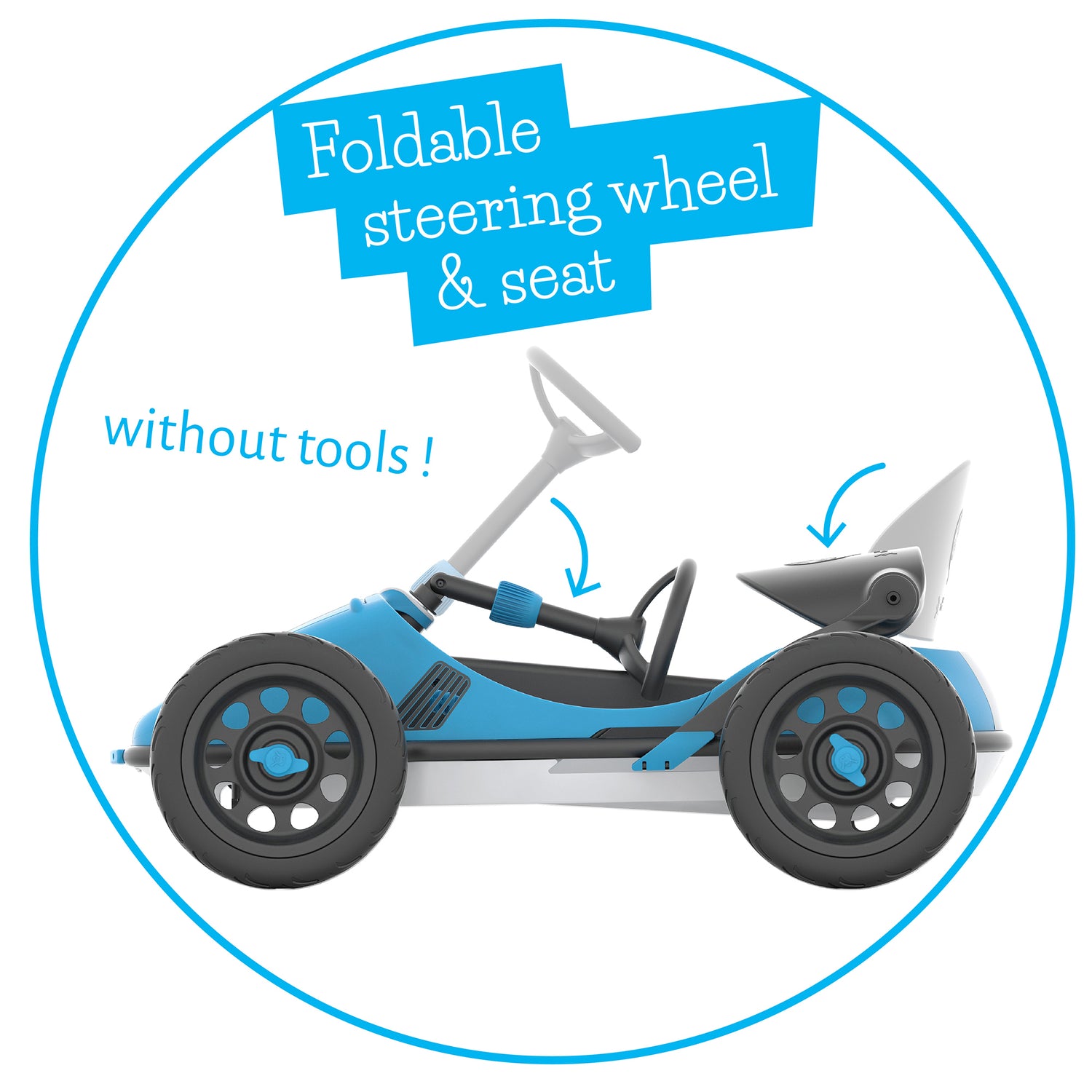 - Foldable for easy storage: the backrest of the seat folds down without tools, you unscrew the steering wheel and the steering column folds down to reduce the size.