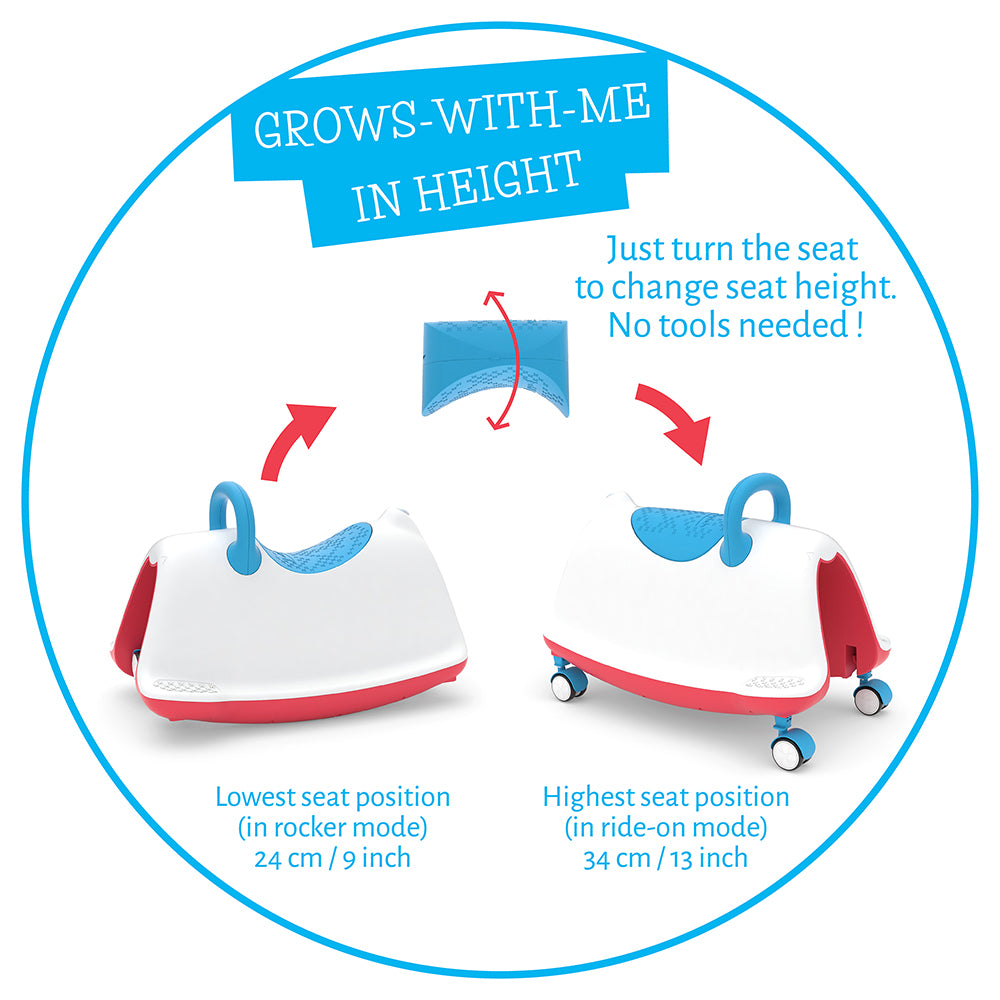 - Grows-with-me in seat height: just push out the seat from the bottom, flip it over and you have a slightly higher seat. Lowest seat position (in rocker mode) : 9 inch / 24 cm and highest seat position (in ride-on mode) : 13 inch / 34 cm